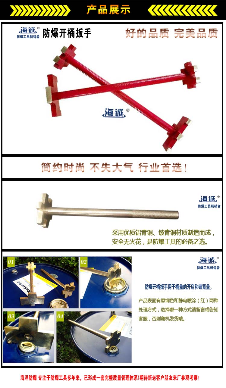 2、雙頭開桶扳手|防爆雙頭開桶扳手|鈹青銅防爆雙頭開桶扳手|鋁青銅防爆雙頭開桶扳手適用范圍:石油精煉和石油化學工業(yè)、煤礦、油田、天然氣化學工業(yè)、火藥工業(yè)、化纖工業(yè)、油漆工業(yè)、肥料工業(yè)、各種藥品工業(yè)。石油輪和液化石油氣的車輛、飛機、經(jīng)營易燃易爆品的倉庫、電解車間、通訊機裝配車間、要求工具不生銹、耐磨抗磁的場所等。