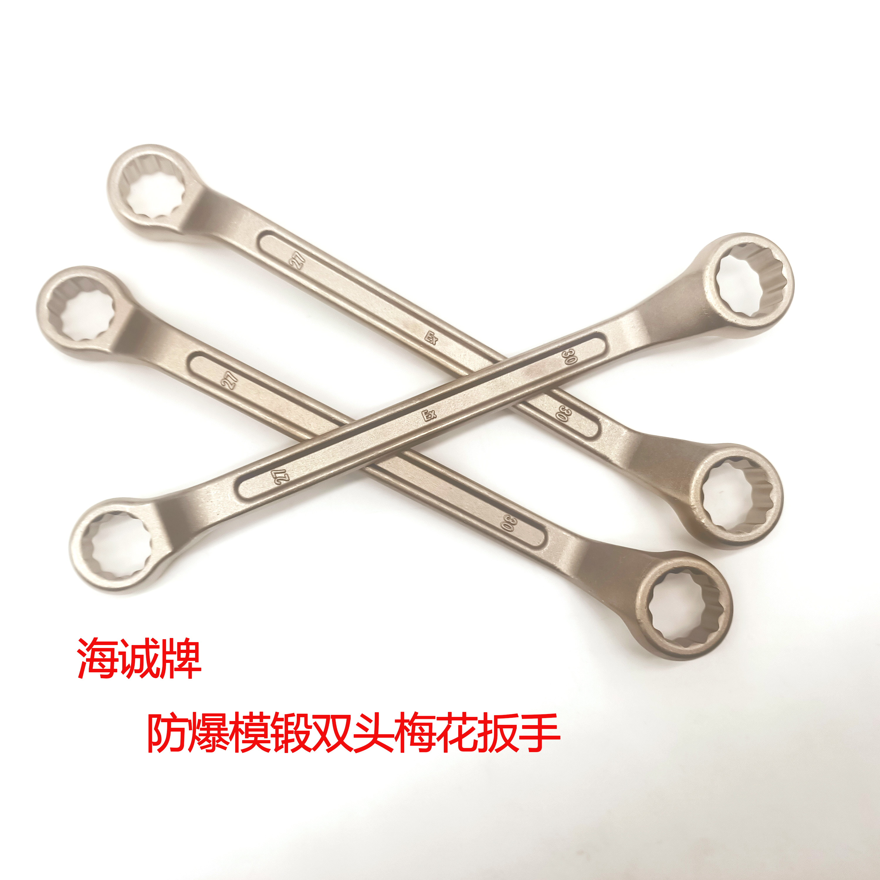 防爆雙頭梅花扳手適用于:制氣、儲運、冾金、采用、采氣、煉化、軍工、煤礦等易燃易爆場所,防爆雙頭梅花扳手材質(zhì)分為鋁青銅合金、鈹青銅合金,防爆工具2種材質(zhì)其防爆性能一樣,鋁青銅合金有微磁性硬度在25度,鈹青銅無磁性硬度大于等于35度,銅合金材質(zhì)由于銅的導(dǎo)熱性良好使用工具摩檫撞擊時產(chǎn)生的熱量被吸收并傳導(dǎo),因銅材質(zhì),本質(zhì)比較軟,有很好的避讓性,不易產(chǎn)生微小的顆粒 不產(chǎn)生火花,又稱無火花工具。