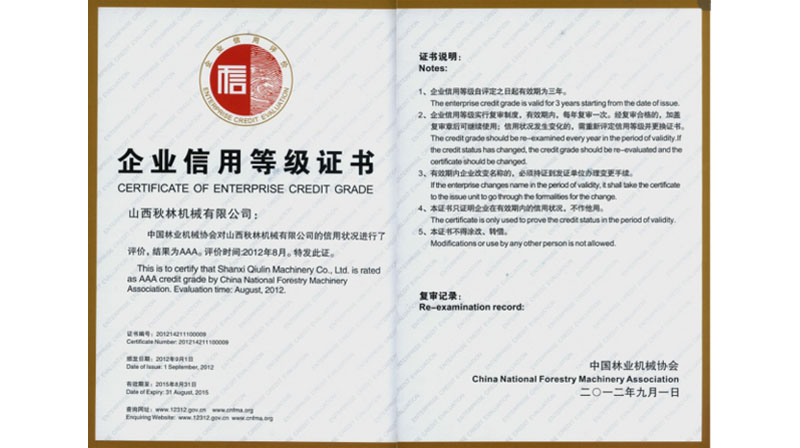 獲中國林業(yè)機械協(xié)會頒發(fā)的AAA級企業(yè)信用等級證書