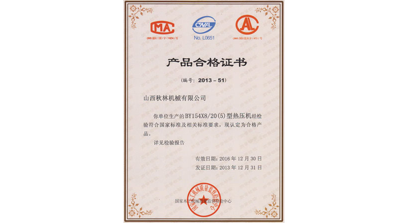 BY21型熱壓機、BY624×8/16、BY154×8/20(5)通過國家木工機械質量監(jiān)督檢驗中心檢驗