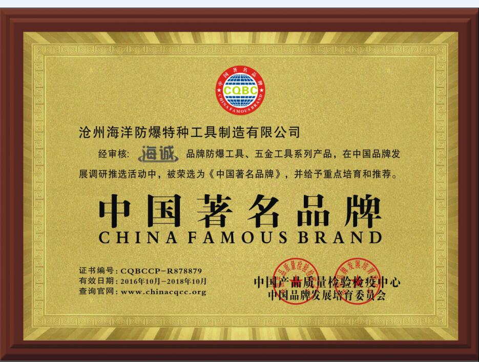 “海誠”商標榮獲中品,標志著我公司生產(chǎn)的設(shè)備和技術(shù)達到水平,產(chǎn)品質(zhì)量得到了廣大客戶的喜愛與推廣。我公司(海洋防爆工具)將不忘初心,始終站在時代前言,用海洋人的勤勞和智慧譜寫著海洋輝煌的明天。