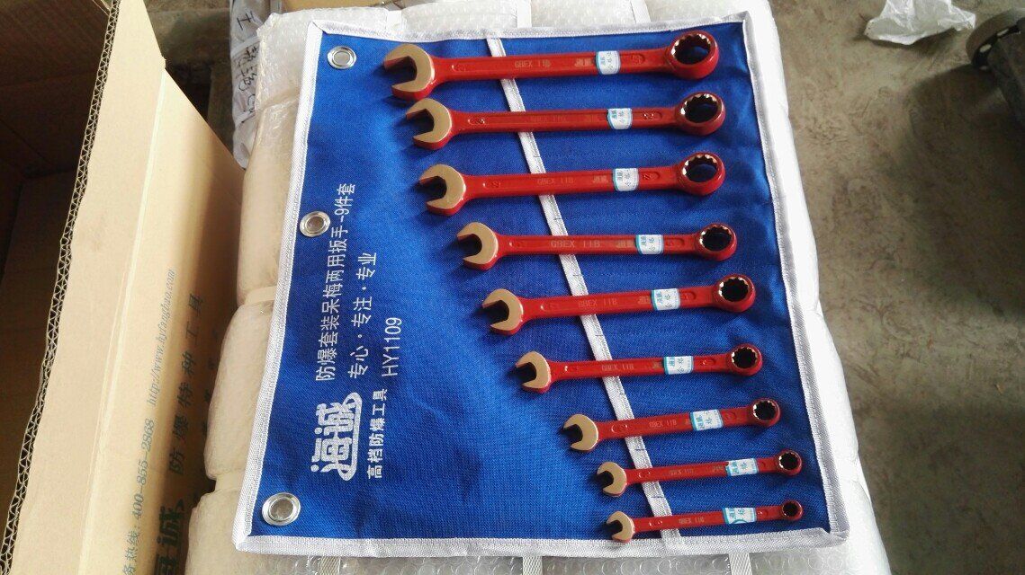 防爆兩用扳手:一端與單頭呆扳手相同,另一端與梅花扳手相同,兩端擰轉(zhuǎn)相同規(guī)格的螺栓或螺母.防爆兩用扳手,原材料采用鈹青銅、鋁青銅合金材料 防爆兩用扳手產(chǎn)品規(guī)格有:6-7-8-9-10-11-12-13-14-15-16-17-18-19-20-21-22-23-24-25-26-27-30-32-34-36-38-41-46-50-55-60-65-70mm。防爆兩用扳手適用范圍:可廣泛應(yīng)用于石油、石化、油站、油庫、采氣、化工、軍工、電力、礦山、電子、鐵路、等潛在火患和爆炸的危險環(huán)境中,也是機(jī)械制造和機(jī)械維修必不可少的專用工具. 防爆兩用扳手經(jīng)過加工處理后的鈹青銅產(chǎn)品的抗拉強(qiáng)度可以達(dá)到35度以上,而且這種材質(zhì)的產(chǎn)品能防磁,所以這種產(chǎn)品又是既防爆又防磁的產(chǎn)品,特別適合于在要求更高的工作場所使用鋁青銅的防爆兩用扳手的抗拉強(qiáng)度能達(dá)到25度以上.防爆兩用扳手是常用的扳手,在機(jī)加工車間加工完畢后,會進(jìn)行一系列的檢驗(yàn)。防爆兩用扳手 外觀質(zhì)量檢驗(yàn):扳手表面不應(yīng)有裂縫、毛刺及明顯的夾縫、切痕、氧化皮等缺陷,柄部應(yīng)平直。尺寸檢驗(yàn):扳手的外形尺寸應(yīng)符合GB4388和GB4389兩標(biāo)準(zhǔn)的有關(guān)規(guī)定。扳手的開口和扳手孔的公差應(yīng)符合GB4390標(biāo)準(zhǔn)的規(guī)定。防爆兩用扳手產(chǎn)品規(guī)格:S6---S55MM。具有設(shè)計(jì)合理、結(jié)構(gòu)穩(wěn)定、材質(zhì)密度高、抗打擊能力強(qiáng),不折、不斷、不彎曲,產(chǎn)品尺寸精度高、經(jīng)久耐用等特點(diǎn)。